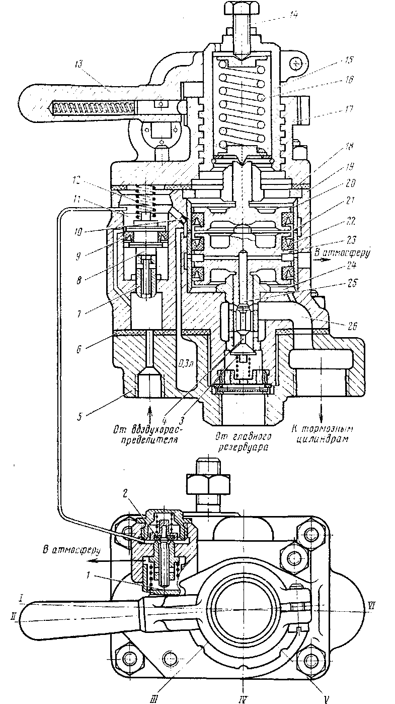 Для снижения давления в тормозных цилиндрах ручку 13 переводят по часовой стрелке, при этом стакан 15 вывертывается из крышки 17, усилие пружины 16 уменьшается. Под избыточным давлением воздуха в полости 24 поршни 23 и 20 поднимаются вверх и воздух из тормозных цилиндров через внутренний канал 25 в поршне 23 выходит в атмосферу. Давление в тормозных цилиндрах будет снижаться до тех пор, пока усилие пружины 16, соответствующее данному положению ручки 13 крана, не преодолеет давления воздуха, действующего па поршень 23 снизу, после чего последний опустится и закроется канал 25. При перемещении ручки крана в положение II действие пружины 16 на пор щень прекратится и произойдет полный отпуск тормозов.