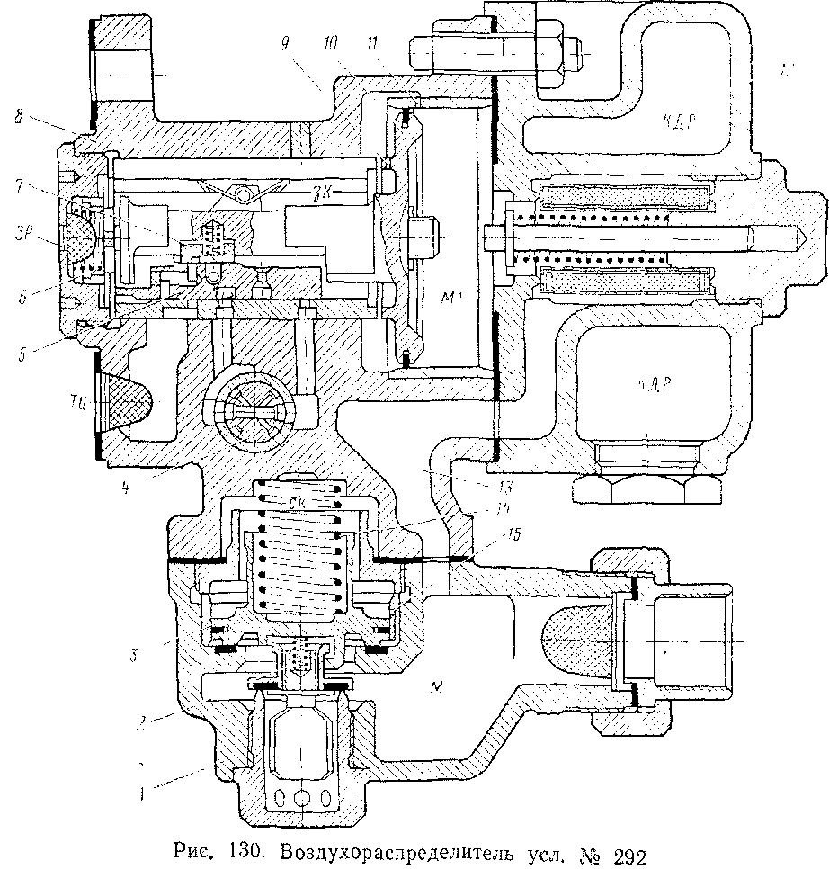 расположенную с правой стороны магистрального поршня 10. Из этой камеры через три отверстия 11 диаметром 1,25 мм во втулке магистрального поршня и одно отверстие 9 диаметром 2 мм в торце этого поршня воздух переходит в золотниковую камеру ЗК, сообщающуюся с запасным резервуаром. Кроме того, воздух из камеры М1 поступает под отсекательный золотник 7. Из камеры М воздух проходит под поршень 3 срывного клапана, отжимает его от седла на 3,5 мм и через дроссельное отверстие 15 диаметром 0,8 мм наполняет камеру СК над поршнем, откуда поступает под главный золотник.