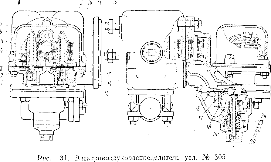Электровоздухораспределитель усл. № 305 применяется в пассажирских поездах с локомотивной тягой. Он состоит из четырех основных узлов (рис. 131): рабочей камеры 12, корпуса 3 электрической части, пневматического реле 23 и переключательного клапана 15. На рабочей камере 12 устанавливают съемные части электровоздухораспределителя и воздухораспределителя. Она имеет четыре фланца и полость объемом 1,5 л, которая является управляющим резервуаром реле давления. К одному из фланцев через прокладку крепится электрическая часть, на этом же фланце размещена колодка с электрическими контактами.
