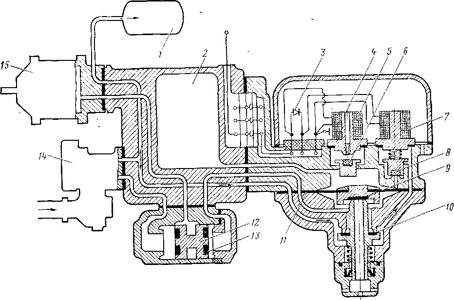 из запасного резервуара / по каналам через открытый клапан 10 подходит к переключательному клапану 12, перебрасывает его влево и поступает в тормозной цилиндр. При этом клапан 12 своим уплотнением 13 садится на седло и разобщает воздухораспределитель 14 и тормозной цилиндр 15. Время наполнения тормозного цилиндра сжатым воздухом и давление в нем зависят от времени наполнения рабочей камеры 2 объемом 1,5 л и давления в ней, что в свою очередь определяется длительностью возбуждения катушки тормозного вентиля 7. Через калиброванное отверстие диаметром 1,8 мм в седле тормозного клапана наполняется камера 2, а следовательно, и тормозной цилиндр 15 до давления 3 кгс/см2 за 2,5—3,5 с независимо от диаметра и выхода штока тормозного цилиндра.
