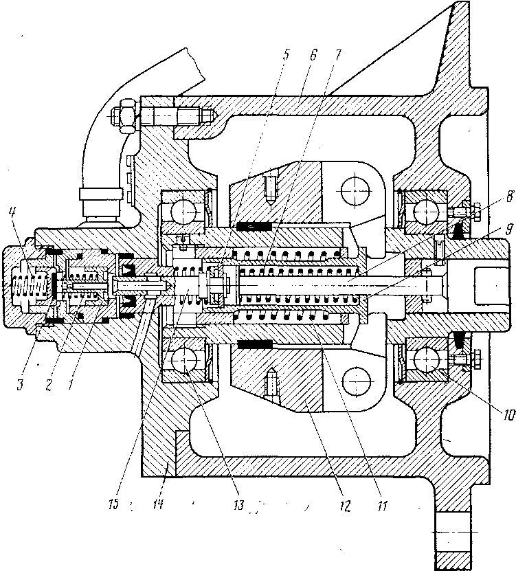 Центробежный регулятор (рис. 134) с осью колесной пары соединяется валиком 8, который при движении электровоза вращает грузы 12. Хвостовики грузов упираются в хомут 9, отжимаемый в сторону колесной пары пружиной 7. Пружина 11 находится между хомутом и валиком. Валик совместно с хомутом, грузами и пружинами вращается в подшипниках 10 и 13, укрепленных в корпусе 6 и крышке 14. Внутри хомута находится подшипник 5, напрессованный на поршень 15.