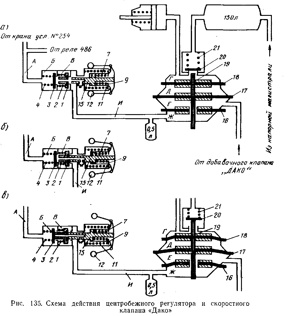 Если скорость движения ниже 80 км/ч, центробежный регулятор сообщает резервуар объемом 0,5 л с атмосферой и скоростной клапан «Дако» обеспечивает понижение давления в тормозных цилиндрах до 3,8 кгс/см2. Когда ручки разобщительных кранов 1008, 1009 стоят в закрытом положении, то воздух к центробежному регулятору не подходит. При торможении воздух из запасного резервуара через воздухораспределитель поступает в управляющие резервуары и далее в скоростной клапан «Дако», благодаря чему из резервуара объемом 150 л воздух поступает в тормозные цилиндры, доводя в них давление до 3,8 кгс/см2. Управляющие резервуары являются фиктивными тормозными цилиндрами, а резервуар объемом 0,5 л служит для увеличения объема камеры скоростного клапана «Дако».