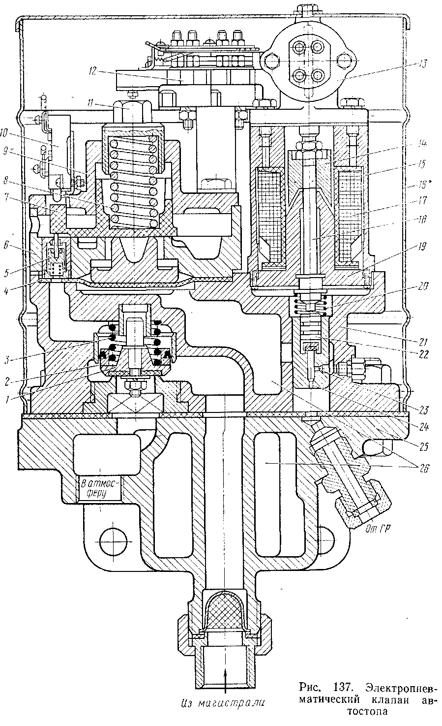 Электропневматический клапан автостопа уел- № 150И (рис. 137) — основной прибор автостопной системы, связывающей электрическую часть устройства с пневматической системой тормоза локомотива и поезда. Он состоит из следующих основных частей: кронштейна 25, корпуса 21, средней части 6, корпуса замка 13 и электромагнитного вентиля 15.