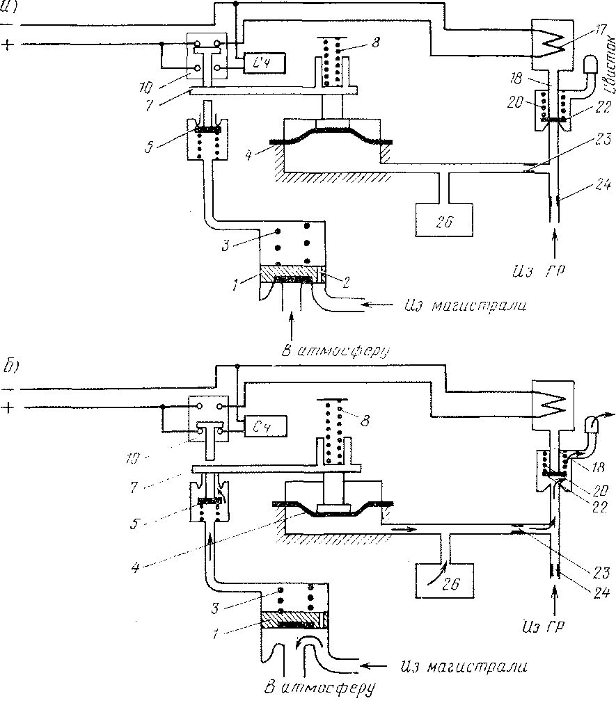 Рис. 138. Схема электропневматического клапана автостопа в нормальном положении (а) и при экстренном торможении (б)