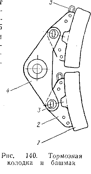 резьбу; гайка поднимается и перемещав' рычаг, который соединен с рычажной пере дачей пневматического тормоза. Тормоз ные колодки / (рис- 140) с помощью чек і устанавливают на башмаках 2. Башмакр валиками 3 крепят к балансируй, а балан сир к рычагу рычажной передачи. Для предупреждения выпадания чек в их проушины вставлены шплинты.