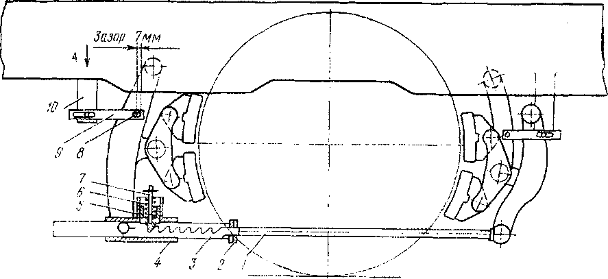 К регулирующему устройству относятся также корректирующие планки 9, установленные на кронштейнах 10 и прижимаемые к ним пружинами. Другой конец корректирующей планки свободно насажен на валик 8 овальным отверстием, благодаря чему обеспечивается зазор 7 мм между валиком и поверхностью отверстия в планке при отпущенном тормозе.