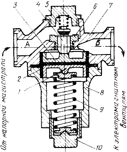 Для снижения давления в напорной магистрали до 7 кгс/см2 установлены редукционные клапаны (рис. 146). К клапану подводятся трубопроводы от напорной магистрали и от электро-пневматнческих вентилей. К седлу 6, запрессованному в корпусе 7, пружиной 5 прижат клапан 4. К нижней части корпуса болтами прикреплен стакан 8. Между корпусом 7 п стаканом 8 установлена резиновая диафрагма 2 с верхней 3 и нижней 1 тарелками. На верхнюю тарелку действует хвостовиком клапан 4, а па нижнюю давит пружина 9, которая упирается в регулировочную гайку 10.