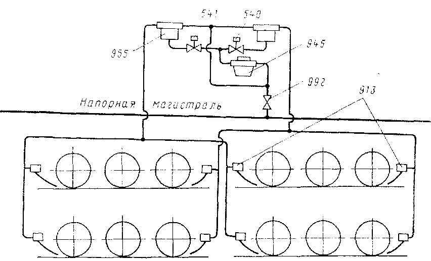 Управление песочницами электрическое, осуществляется кнопками из каждой кабины машиниста. Воздух из напорной магистрали (рис. 148) через разобщительный кран 992 подходит к редукционному клапану 945 и клапанам песочниц 955. После понижения редукционным клапаном давления до 7 кгс/см2 воздух поступает в электропневматическпе вентили 540 и 541. Редукционный клапан 945 по конструкции не отличается от установленного в цепн звуковых сигналов. При нажатии соответствующей кнопки в кабине машиниста возбуждается одни из электропневматическпх вентилей и воздух подается на один из клапанов песочниц. Клапан песочницы 955 при возбуждении электропневматического вентиля 540 и 541 обеспечивает свободный проход воздуха из" напорной магистрали к форсункам 913, расположенным в нижней части рамы электровоза.