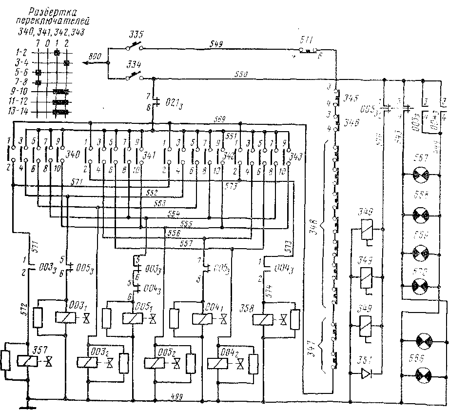 Переключатели 340—343 осуществляют также включение и выключение разъединителей 003, 004 и заземлителя 005. Для управления токоприемниками предназначены их контакты 1-2. Па-пряжение к ним подается от общего провода 800 через автоматический защитный выключатель 335, контакты 4-6 переключателя 511 блока отыскания неисправностей системы «ПУМ-Шко-да», контакты 3-4 аварийных выключателей «Стоп» 345 и 346, девять последовательно включенных блокировок безопасности 347, 348.