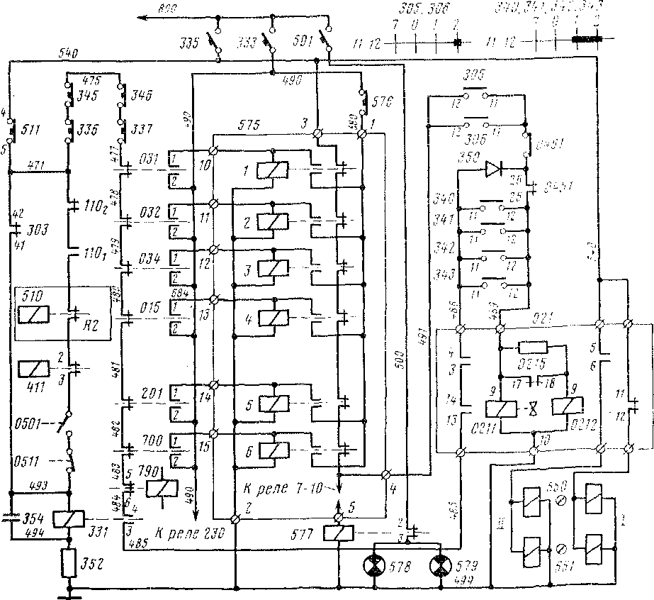 Для сигнализации срабатывания аппаратов защиты в кабинах машиниста служит реле 577, в цепь питания которого от провода 540 последовательно включены размыкающие контакты всех сигнальных реле блока 575. Как только катушка реле 577 обесточится, замкнутся его контакты в цепи сигнальных ламп 578, 579.
