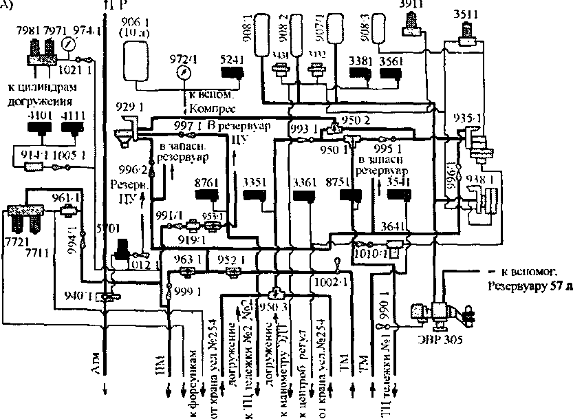 в) через разобщительный кран 1021, редукционный клапан 921, вентили 797, 798 в цилиндры противоразгрузочного устройства 1025/1,1025/2 (1025/3, 1025/4). Для контроля давления воздуха в цилиндрах установлен манометр 974. Редукционный клапан 921 регулируется на давление 5,4 кгс/см";