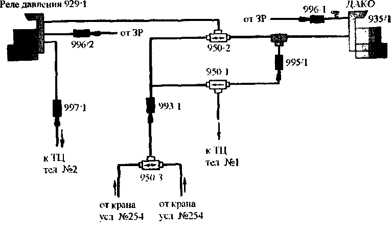 д) через разобщительный кран 993, редукционный клапан 920 (9,0/6,8 кгс/см2) к электропневматическим вентилям тифона 787 или свистка 789: