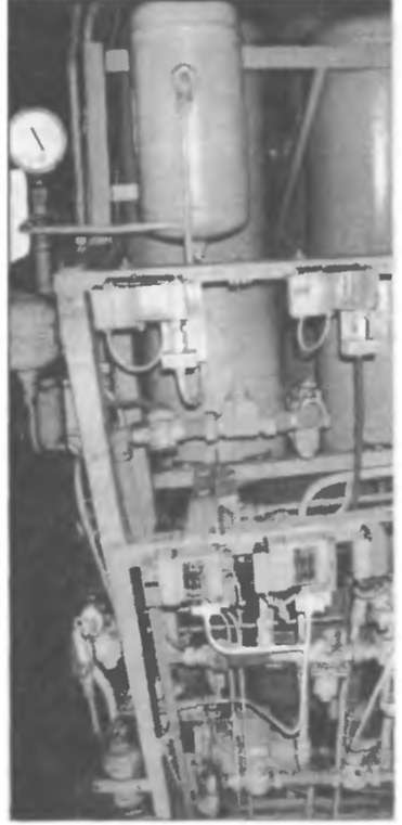Из напорной магистрали воздух поступает: а) через разобщительный кран 991, дроссельный (редукционный) клапан 919, регулируемый на давление 4,7 кгс/см2, обратный клапан 953, фильтр 915 в резервуаре 903 объемом 120 л.