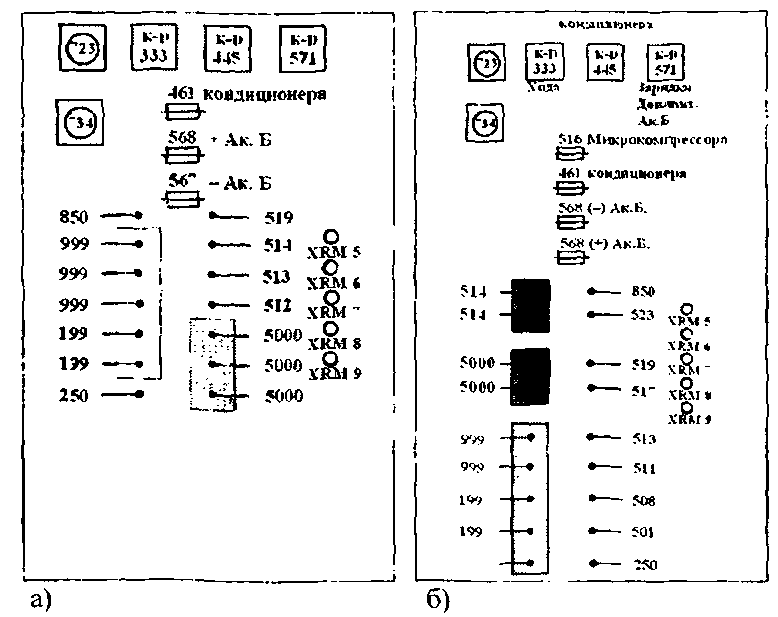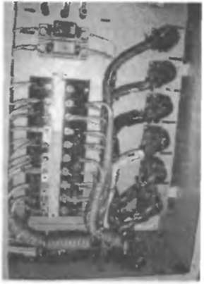 Рис. 121 Монтаж клемм проводов и контакторов в шкафу промежуточного коридора электровозов серии Е6(а ) - Е7 (б)
