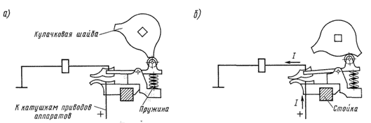 Против каждой шайбы на стойках укреплены подвижные и неподвижные контакты (контакторные элементы), к которым присоединены провода цепей управления.