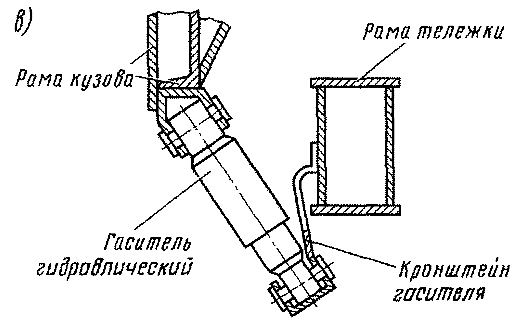 Их крепят к кронштейнам, приваренным к рамам кузова и тележки. Энергия, возникающая при колебаниях кузова, поглощается приборным маслом, перемещаемым поршнем в цилиндре гасителя. В гасителе при растяжении масло поступает из специальной камеры через открывшийся клапан под поршень. При сжатии гасителя клапан закрывается, и масло вытесняется через специальные калиброванные щели в нем. При прохождении жидкости через них возникает вязкое трение, в результате чего происходит превращение механической энергии колебательного движения экипажа в тепловую и последующее ее рассеяние в рабочей жидкости. Если кузов отклонится от центрального положения больше, чем допускается, в работу вступит упор, снабженный пружиной большой жесткости (рис. 109, г).