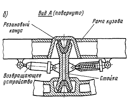 Каждая центральная опора снабжена возвращающим устройством: оно возвращает кузов в исходное положение при поперечных его отклонениях. Состоит это устройство из пружин, помещенных в цилиндры, которые шарнирно связаны с центральной опорой и рамой кузова. Для большей устойчивости кузова пружины предварительно сжимают.