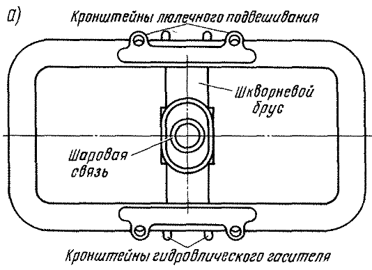 На электровозе ВЛ80 применено люлечное подвешивание кузова, которое позволяет снижать горизонтальные ускорения кузова, а также боковые давления колес электровоза на рельсы и передает вертикальные нагрузки от кузова на рамы тележек. Для крепления люлечного подвешивания к раме кузова (рис. 109, а) приварено четыре кронштейна.