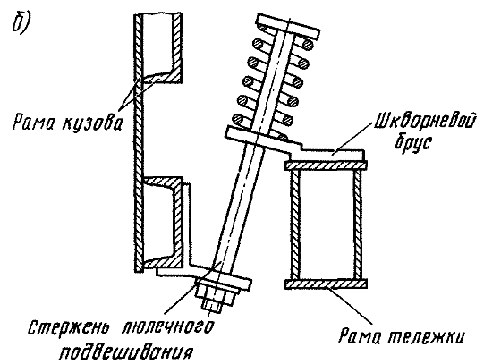 Люлечное подвешивание (рис. 109, б) состоит из стержня, который имеет в верхней части фланец, опирающийся на пружину. Пружина своим нижним витком упирается в кронштейн, приваренный к раме тележки.