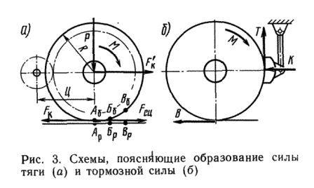 Если бы колеса электровоза не касались рельсов, то после пуска тяговых двигателей они бы просто вращались, оставаясь на одном и том же месте. Однако из-за того, что колеса локомотива соприкасаются с рельсами при передаче на оси колесных пар вращающих моментов М, между поверхностями колес и рельсами появляется сила сцепления.