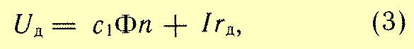 Чтобы оценить возможности регулирования частоты вращения двигателя постоянного тока, напомним, что при вращении в магнитном поле проводников обмотки якоря двигателя в них возникает (индуцируется) электродвижущая сила (э. д. с). Направление ее определяют, пользуясь известным правилом правой руки. При этом ток, проходящий по проводникам якоря от источника энергии, направлен встречно индуцируемой э. д. с. Напряжение Uд, подведенное к двигателю, уравновешивается э. д. с., наводимой в обмотке якоря, и падением напряжения в обмотках двигателя: