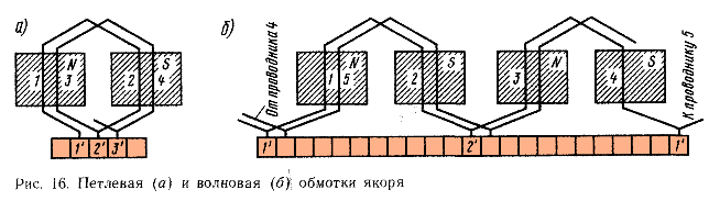 Современные электрические машины постоянного тока, в том числе и тяговые двигатели, обычно делают многополюсными, т. е. они имеют не одну, а две, три и более пар полюсов. При этом проводники обмотки якоря могут быть соединены двумя способами, и в зависимости от этого получают обмотки двух типов — петлевую и волновую.