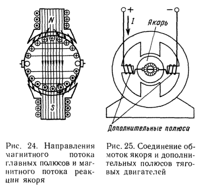 Как же добиться, чтобы при коммутации не возникло сильное искрение? В тяговых двигателях, как и в большинстве других двигателей постоянного тока, для этого устанавливают дополнительные полюса. Магнитный поток, создаваемый ими, должен быть направлен так, чтобы в коммутируемых секциях при их перемещении наводилась э. д. с, равная реактивной и направленная навстречу ей. Реактивная э. д. с. непостоянна. Она изменяется пропорционально току якоря. Э. д. с, создаваемая дополнительными полюсами, должна изменяться так же. Это условие будет выполнено, если по обмотке дополнительных полюсов будет проходить тот же ток, что и по обмотке якоря. Поэтому обмотку якоря и обмотки дополнительных полюсов необходимо соединить последовательно (рис. 25).