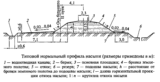 Типовой нормальный профиль насыпи приведен на рис. 8. Верхняя часть, на которую укладывают балласт, шпалы и рельсы, называется основной площадкой. На однопутных линиях основная площадка имеет форму трапеции с шириной верхней части 2,3 м и высотой 0,15 м, а на двухпутных — форму равнобедренного треугольника высотой 0,2 м. Такое очертание основной площадки способствует стоку воды, проникающей через балластный слой во время дождя и таяния снега.