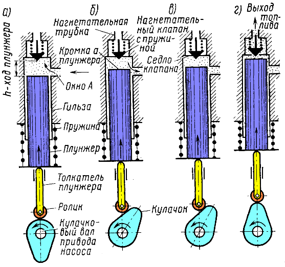 Проследим, как плунжер такого насоса подает топливо. Когда плунжер находится в нижнем положении, топливо через окно А заполняет пространство над плунжером (рис. 73, а). При вращении кулачкового вала привода топливного насоса кулачок набегает на ролик толкателя (рис. 73, б), плунжер начинает двигаться вверх и верхней кромкой а постепенно закрывает окно А. При этом нагнетательный клапан, прижатый к своему седлу пружиной, испытывает снизу давление топлива, вытесняемого плунжером, а сверху — усилие пружины и давление топлива, оставшегося в трубопроводе. Пока усилие на клапан, создаваемое давлением топлива, меньше усилия, создаваемого пружиной, клапан закрыт и часть топлива, не имея другого выхода, устремится из надплунжерного пространства обратно в окно 4 (см. рис. 73, б). Когда плунжер кромкой а полностью закроет окно А (рис. 73, в), вытекание топлива через него прекратится. Примерно с этого момента при продолжающемся ходе плунжера вверх начнется нагнетание: давление топлива преодолеет усилие пружины нагнетательного клапана, он откроется, и топливо будет через трубопровод поступать в форсунку до тех пор, пока плунжер не достигнет своего крайнего положения (рис. 73, г). Когда плунжер начинает двигаться вниз, прекращается подача топлива. Нагнетательный клапан под действием пружины снова садится на свое седло. Сбегая с выступа кулачка, ролик вместе с толкателем и плунжером возвращается в первоначальное положение (см. рис. 73, а).