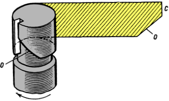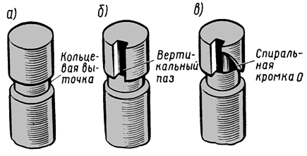 Каким же образом можно изменять (регулировать) количество подаваемого топлива, не усложняя слишком конструкцию топливного насоса? Наиболее просто изменение подачи топлива в таком диапазоне решается путем изменения активного хода плунжера. Для этого конструкцию верхней части плунжера, называемую головкой, надо изменить. На некотором расстоянии от верхней кромки плунжера сделаем поперечную кольцевую выточку (рис а). Теперь как показано на рис.б, в головке плунжера прорежем и вертикальный сквозной паз. После этого часть металла головки уберем таким образом, чтобы на ней образовался специальный косой срез—со спиральной (винтовой) кромкой О. В результате головка плунжера примет вид, изображенный на рис. в.