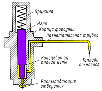 Для впрыска топлива необходимо приподнять иглу, прижатую пружиной. Это осуществляется за счет высокого давления топлива. Впрыскивание происходит, когда давление топлива, действующее на кольцевой заплечик иглы, создает усилие, достаточное для сжатия пружины при подъеме иглы. Тогда топливо со значительной скоростью устремляется в цилиндр дизеля через распиливающие отверстия, расположенные за иглой в нижней части корпуса распылителя (соплового наконечника). Начальное давление впрыска, необходимое для поднятия иглы и определяемое затяжкой пружины, обычно равно 19,6 — 31,3 МПа (200—320 кгс/см2).