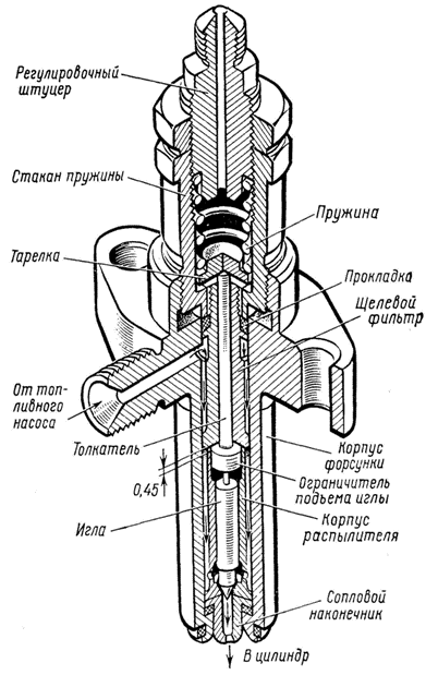 Топливо, поступающее от насоса, проходит щелевой фильтр, задерживающий случайно попавшие в топливо крупные частицы грязи, и направляется по пазам и каналам в полость, окружающую нижний конец иглы. Далее форсунки работают так, как описано выше.