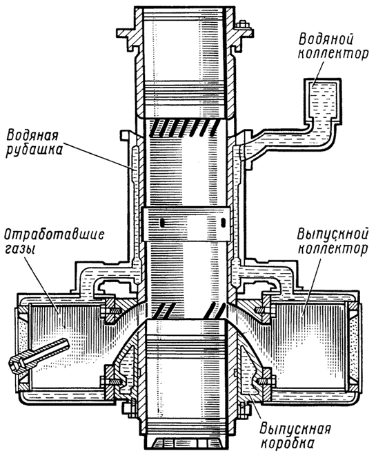 Начнем с того, что вода, нагнетаемая центробежным насосом, при давлении 0,314 МПа (3,2 кгс/см2) на номинальном режиме работы дизеля 10Д100, т. е. при 850 об/мин коленчатого вала, попадает в водяные полости двух выпускных патрубков. Отсюда она проходит в водяные полости правого и левого выпускных (газовых) коллекторов, расположенных с двух сторон дизеля 10Д 100, и далее в охлаждающие полости выпускных коробок (рис. 100). Через переходные патрубки вода направляется в водяные рубашки всех десяти цилиндровых втулок дизеля. Каждая втулка охлаждается водой в средней части. Верхняя часть втулки, находящаяся в отсеке воздушного ресивера, нагревается меньше, поэтому водяного охлаждения не имеет, а охлаждается наддувочным воздухом.