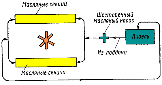 Рис. 109. Схема циркуляции масла внутри дизеля