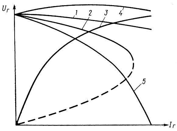 если магнитные потоки обеих обмоток его возбуждения имеют одинаковые направления, может поддерживать на своих выводах напряжение близкое к постоянному. При встречном направлении магнитных потоков обмоток возбуждения напряжение генератора с увеличением тока нагрузки резко снижается за счет размагничивания последовательной обмоткой. Но его внешняя характеристика представляет собой выпуклую кривую (кривая 5, рис. 142), отличающуюся от гиперболы.