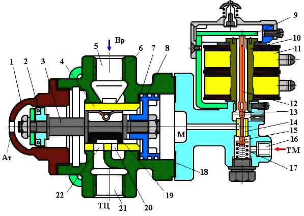 Пневматическая часть состоит из крышки 1 и корпуса 6. Внутри пневматической части расположены два поршня 2 и 8, жестко закрепленные на стержне 3. Площадь поршня 8 примерно в два раза больше площади поршня 2. Поршень 3 в крайних положениях уплотнен прокладками 7 и 18. Между двумя буртами стержня 3 помещен золотник 19 с выемкой. Запрессованная в корпус 6 золотниковая втулка 4 имеет отверстие 22 диаметром 9 мм для сообщения воздухораспределителя с каналом 21 ТЦ и отверстие 20 диаметром 6 мм для сообщения ТЦ с атмосферой. Электроблокировочный клапан имеет также канал 5 для сообщения с воздухораспределителем или с краном вспомогательного тормоза. Атмосферное отверстие в крышке 1 исключает создание противодавления при перемещении поршневой системы в крайнее левое положение.