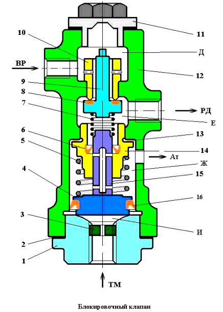 Блокировочный клапан состоит из корпуса 12, крышки 1 с дроссельной