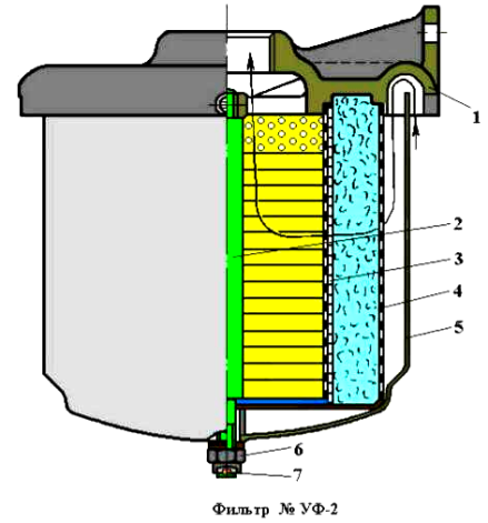 Фильтр усл.№ УФ-2 предназначен для очистки всасываемого компрессором атмосферного воздуха. Фильтр имеет фланец 1, к которому присоединяется всасывающая труба компрессора. На стержне 2 укреплен сетчатые цилиндры 3 и 4, между стенками которых помещена фильтрующая набивка из конского волоса, латунной проволоки диаметром 0,05 мм или трех колец из капронового волокна, обработанных специальной эмульсией. Оба цилиндра закрыты кожухом 5, который закреплен на стержне корончатой гайкой 6 со шплинтом 7. Атмосферный воздух всасывается через кольцевой зазор между фланцем 1 и кожухом 5, проходя через сетчатые цилиндры и фильтрующую набивку, очищается и поступает в компрессор. Фильтры усл.№ Э-114 имеют волосяную фильтрующую набивку и предназначены для очистки сжатого воздуха, поступающего к отдельным тормозным приборам.