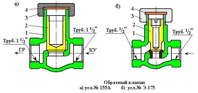 Обратный клапан усл.№ Э-175 аналогично принципу действия описанному выше и устанавливается на трубопроводах с резьбой 1 1/2", в частности на электровозах и электропоездах между резервуаром управления и питательной магистралью.