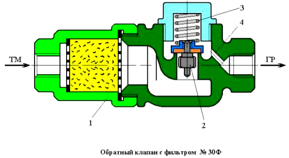 Обратный клапан усл.№ ЗОФ устанавливают между питательной и тормозной магистралями для зарядки ГР локомотива при его пересылке в холодном состоянии. Перед обратным клапаном со стороны ТМ устанавливают разобщительный кран (кран холодного резерва), при открытии которого воздух из тормозной магистрали проходит через расположенный в корпусе 1 фильтр, поднимает нагруженный пружиной 3 клапан 2 с резиновым уплотнением и далее через отверстие 4 диаметром 5 мм попадает в ГР. Пружина 3 не позволяет сжатому воздуху перетекать из ГР в ТМ при снижении в ней давления. Отверстие 4 препятствует резкому падению давления в ТМ в процессе зарядки из нее главного резервуара.