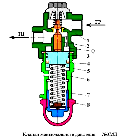 пружина 6 (например, для ТЦ > 3,8 – 4,0 кгс/см2), он опустится, и клапан 2 под