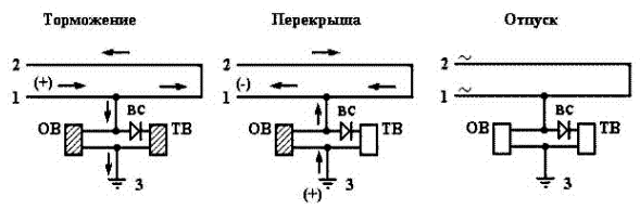 торможении используются все пять линейных проводов, при перекрыше ток протекает