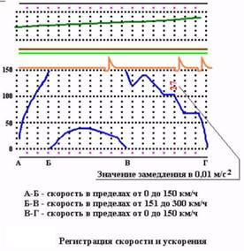 регистрируются: скорость, ускорение, давление в ТМ, сигналы АЛС, время,